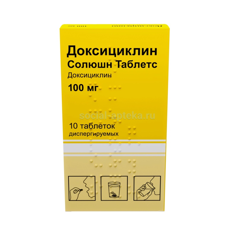 Действующее вещество: доксициклина моногидрат - 104,00 мг, в пересчете на доксициклин - 100,00 мг.