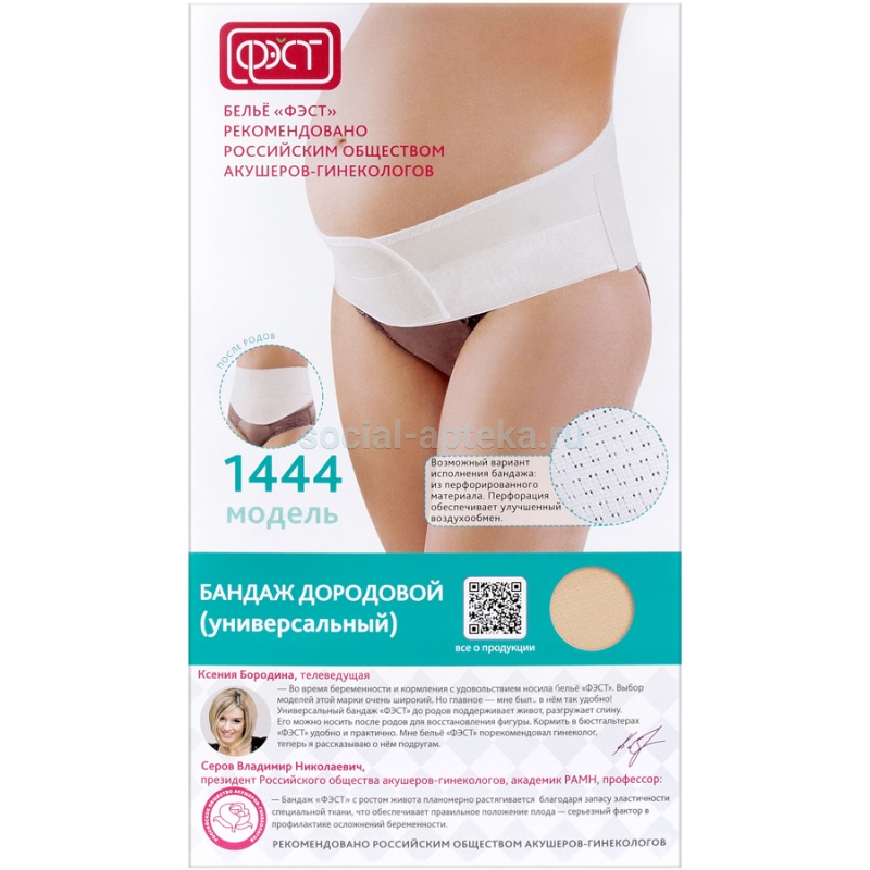 Универсальный бандаж ФЭСТ рекомендован Российским обществом акушеров-гинекологов. Бандаж рекомендовано носить до и после родов. Исследования показали, что при ношении бандажа снижается вероятность: - угрозы прерывания беременности; - преждевременных родов; - образования стрий. Носить рекомендовано: - с 20-24 недели беременности; - при акушерской патологии; - при несостоятельности мышц передней брюшной стенки и тазового дна; - при искривлении позвоночника; - при болях в пояснице; - при активном образе жизни, когда находитесь в вертикальном положении более трех часов в день; - после родов — с первых дней. Перед выбором проконсультируйтесь с акушером-гинекологом.