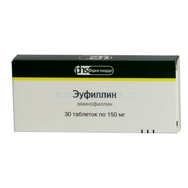Фармгруппа: бронходилатирующее средство. Фармдействие: Эуфиллин - бронхолитическое средство, производное ксантина; ингибирует фосфодиэстеразу, увеличивает накопление в тканях циклического аденозинмонофосфата, блокирует аденозиновые (пуриновые) рецепторы; снижает поступление ионов кальция через каналы клеточных мембран, уменьшает сократительную активность гладкой мускулатуры. Расслабляет мускулатуру бронхов, увеличивает мукоцилиарный клиренс, стимулирует сокращение диафрагмы, улучшает функцию дыхательных и межреберных мышц, стимулирует дыхательный центр, повышает его чувствительность к углекислому газу и улучшает альвеолярную вентиляцию, что в конечном итоге приводит к снижению тяжести и частоты эпизодов апноэ. Нормализуя дыхательную функцию, способствует насыщению крови кислородом и снижению концентрации углекислоты. Оказывает стимулирующее влияние на деятельность сердца, увеличивает силу и число сердечных сокращений, повышает коронарный кровоток и потребность миокарда в кислороде. Снижает тонус кровеносных сосудов (главным образом, сосудов мозга, кожи и почек). Оказывает периферическое венодилатирующее действие, уменьшает легочное сосудистое сопротивление, снижает давление в «малом» круге кровообращения. Увеличивает почечный кровоток, оказывает умеренный диуретический эффект. Расширяет внепеченочные желчные пути. Тормозит агрегацию тромбоцитов (подавляет фактор активации тромбоцитов и PgE2 альфа), повышает устойчивость эритроцитов к деформации (улучшает реологические свойства крови), уменьшает тромбообразование и нормализует микроциркуляцию. Обладает токолитическим действием, повышает кислотность желудочного сока. При использовании в больших дозах обладает энилептогенным действием. Фармакокинетика: После приема внутрь быстро и полно всасывается, биодоступность - 90-100%. Пища снижает скорость абсорбции, не влияя на ее величину (большие объемы жидкости и белки ускоряют процесс). Чем выше принятая доза, тем ниже скорость абсорбции. Время достижения Cmax - 1-2 ч. Vd находится в диапазоне 0.3-0.7 л/кг (30-70% от «идеальной» массы тела), в среднем 0.45 л/кг. Связь с белками плазмы у взрослых - 60%, у больных циррозом печени - 36%. Проникает в грудное молоко (10% от принятой дозы), через плацентарный барьер (концентрация в сыворотке крови плода несколько выше, чем в сыворотке матери). Бронходилатирующие свойства аминофиллин проявляет в концентрациях 10-20 мкг/мл. Концентрация свыше 20 мг/мл является токсической. Возбуждающий эффект на дыхательный центр реализуется при более низком содержании препарата в крови 5-10 мкг/мл. Метаболизируется при физиологических значениях рН с высвобождением свободного теофиллина, который далее подвергается метаболизму в печени при участии нескольких изоферментов цитохрома Р450. В результате образуются 1, 3-диметилмочевая кислота (45-55%), которая обладает фармакологической активностью, но уступает теофиллину в 1-5 раз. Кофеин является активным метаболитом и образуется в небольших количествах. У детей старше 3 лет и у взрослых (в отличие от детей более младшего возраста) феномен кумуляции кофеина отсутствует. T1/2 у детей старше 6 месяцев – 3.7 ч; у взрослых – 8.7 ч; у «курильщиков» (20-40 сигарет в сут) - 4-5 ч (после отказа от курения нормализация фармакокинетики через 3-4 месяца); у взрослых с хронической обстру