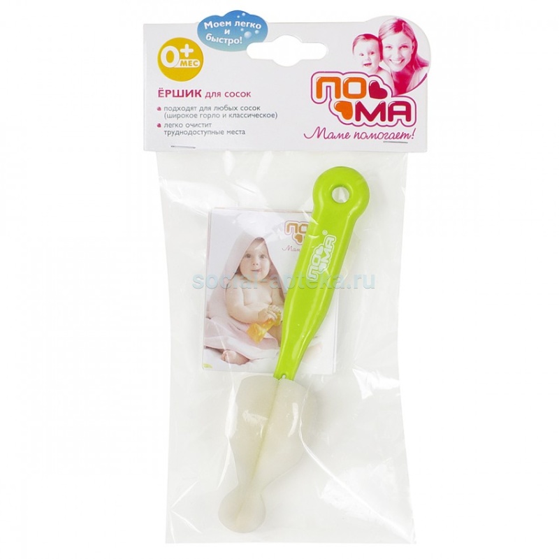 Ёршик с поролоновой губкой позволяет легко и быстро очистить соску от бутылочки любого размера (соски для классических бутылочек и соски для бутылочек с широким горлом) в труднодоступных местах.