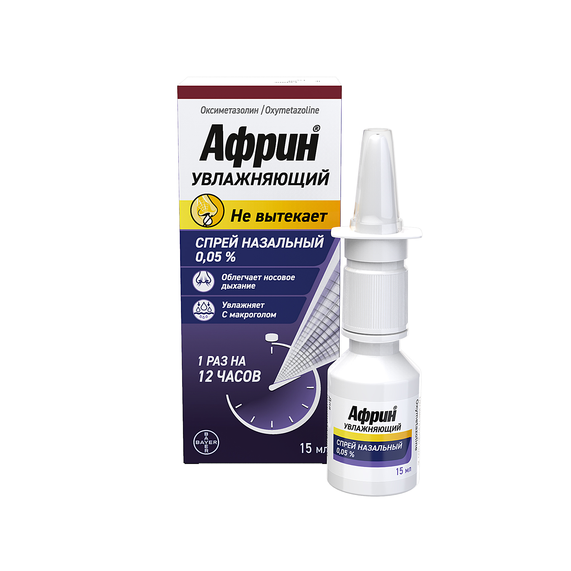 Альфа-адреностимулирующее средство для местного применения. Оказывает сосудосуживающее действие. Оксиметазолин вызывает сужение сосудов слизистых оболочек носа, придаточных пазух и евстахиевой трубы, что приводит к снижению их отека и освобождению носового дыхания при аллергическом и/или инфекционно-воспалительном рините (насморке). За счет наличия в составе лекарственного препарата вспомогательных веществ (целлюлозы микрокристаллической и кармеллозы натрия и повидона-К29-32) Африн® увлажняющий не вытекает из носа и не стекает в горло, так как после введения в носовые ходы спрей становится более вязким и удерживается на слизистых оболочках носа более эффективно, чем стандартный водный раствор. Данный лекарственный препарат содержит увлажняющие вещества (глицерол и макрогол- 1450), способствующие удержанию влаги, что помогает обеспечить увлажнение сухой или раздраженной слизистой оболочки носа. По данным клинических исследований лекарственный препарат начинает действовать в течение 1 минуты и действие продолжается до 12 часов.