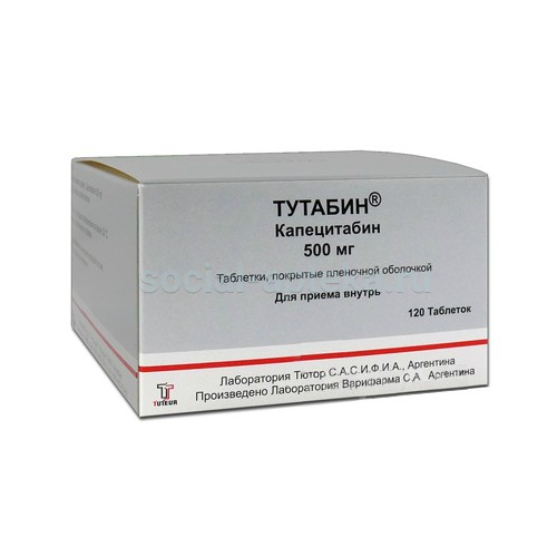Внутрь, запивая водой, не позднее чем через 30 мин после еды.Стандартный режим дозированияМонотерапияПри колоректальном раке, раке толстой кишки и раке молочной железы - по 1250 мг/м2 2 раза/сут - утром и вечером (общая суточная доза 2500 мг/м2) в течение двух недель с последующим семидневным перерывом.Комбинированная терапияПри раке молочной железы - по 1250 мг/м2 2 раза/сут в течение двух недель с последующим семидневным перерывом, в комбинации с доцетакселом в дозе 75 мг/м2 1 раз в три недели в виде в/в инфузии в течение 1 ч.Премедикапия проводится перед введением доцетаксела в соответствии с инструкцией по его применению.При колоректальном раке и раке желудка Тутабин в составе комбинированной терапии назначают в дозе сниженной до 800-1000 мг/м2 2 раза/сут в течение двух недель с последующим семидневным перерывом или до 625 мг/м2 2 раза/сут при непрерывном режиме. Добавление иммунобиологических препаратов к комбинированной терапии не влияет на дозу препарата Тутабин.В адъювантной терапии рака толстой кишки, рекомендованная продолжительность терапии препаратом Тутабин составляет 6 месяцев, т.е. 8 курсов.Противорвотные средства и премедикация для обеспечения адекватной гидратации назначаются перед введением цисплатина согласно инструкциям по применению цисплатина и оксалиплатина.Представленные ниже таблицы показывают примеры расчета стандартной и сниженной дозы препарата Тутабин для начальной дозы 1250 мг/м2 или 1000 мг/м2.Таблица 1. Стандартная и сниженная дозы препарата Тутабин для начальной дозы 1250 мг/м2, рассчитанные в зависимости от площади поверхности тела. Доза - по 1250 мг/м2 2 раза/сут Полная доза 1250 мг/м2Число таблеток на прием (на каждый прием 2 раза/сут - утром и вечером)Сниженная доза (75% от начальной дозы) 950 мг/м2Сниженная доза (50% от начальной дозы) 625 мг/м2Площадь поверхности тела (м2)Доза на прием (мг)500 мгДоза на прием (мг)Доза на прием (мг)≤1,261500311508001,27-1,381650313008001,39-1,521800314509501,53-1,6620004150010001,67-1,7821504165010001,79-1,9223004180011501,93-2,0625005195013002,07-2,182650520001300≥ 2,192800521501450Таблица 2. Стандартная и сниженная дозы препарата Тутабин для начальной дозы 1000 мг/м2, рассчитанные в зависимости от площади поверхности тела Доза - по 1000 мг/м2 2 раза/сут Полная доза 1000 мг/м2Число таблеток на прием (на каждый прием 2 раза/сут - утром и вечером)Сниженная доза (75% от начальной дозы) 750 мг/м2Сниженная доза (50% от начальной дозы) 500 мг/м2Площадь поверхности тела (м2)Доза на прием (мг)500 мгДоза на прием (мг)Доза на прием (мг)≤ 1,26115028006001,27-1,381300210006001,39-1,521450211007501,53-1,661600212008001,67-1,781750213008001,79-1,921800314009001,93-2,0620004150010002,07-2,182150416001050≥ 2,192300417501100Коррекция дозы в ходе леченияОбщие рекомендацииТоксические явления препарата Тутабин можно устранить симптоматической терапией и/или коррекцией дозы препарата (прервав лечение или уменьшив дозу препарата). Если дозу пришлось снизить, нельзя увеличивать ее впоследствии.Если по оценке лечащего врача токсический эффект препарата Тутабин не носит серьезного или угрожающего жизни больного характера, лечение может быть продолжено в начальной дозе без ее уменьшения или прерывания терапии.При токсичности 1-ой степени дозу не меняют. При токсичности 2-ой или 3-ей степени терапию препаратом Тутабин следует прервать.При исчезновении признаков токсичности или уменьшении последней до 1-ой степени, проведение терапии препаратом Тутабин может быть возобновлено в полной дозе или скорректи