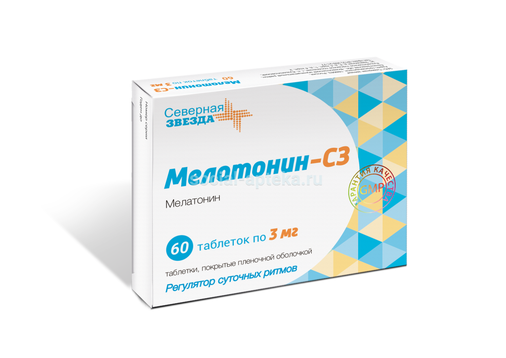 Одна таблетка содержит. Действующее вещество: мелатонин - 3 мг. Вспомогательные вещества: целлюлоза микрокристаллическая - 48,5 мг; карбоксиметилкрахмал натрия - 6,5 мг; кальция гидрофосфата дигидрат - 41,0 мг; магния стеарат - 1,0 мг. Состав оболочки: гипромеллоза - 1,53 мг; полисорбат-80 (твин-80) - 0,64 мг; тальк - 0,51 мг; титана диоксид Е 171 - 0,32 мг.