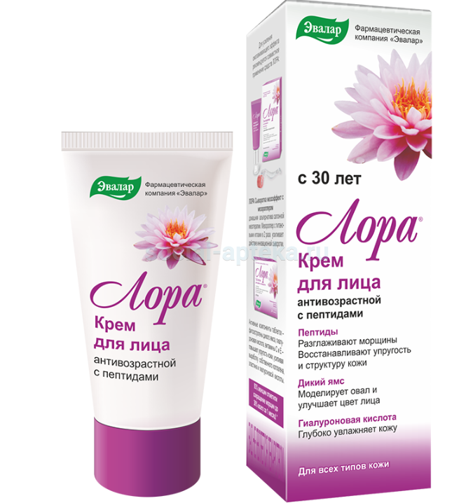 - Экстракт дикого ямса содержит растительный фитоэстроген – дегидроэпиандростерон, более известный как ДГЭА. Его называют «источником юности». Ускоряет обновление клеток кожи, увеличивает синтез коллагена и гиалуроновой кислоты. 1 - Гиалуроновая кислота – главный компонент межклеточного вещества дермы, обеспечивающий упругость, один из лучших увлажнителей, позволяющий «омолодить» и длительно сохранить кожу в хорошем состоянии.2 Пептидная косметика дает возможность «включать» механизмы омоложения в глубоких слоях кожи. Антивозрастной крем для лица «ЛОРА» - это особая комбинация пептидов в комплексе с диким ямсом и гиалуроновой кислотой: разглаживает морщины, увеличивает упругость кожи за счет усиления синтеза коллагена, эластина и гиалуроновой кислоты. Пептиды усиливают синтез коллагена и защищают его от разрушения, укрепляя дермальный слой кожи, разглаживая рельеф и уменьшая глубину морщин; увеличивают синтез собственной гиалуроновой кислоты, повышая упругость и прочность волокон коллагена, сводя к минимуму обвисание кожи.
