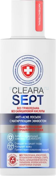 Антибактериальный лосьон ClearaSept предназначен для очищения и увлажнения кожи лица. Рекомендован для проблемной кожи, склонной к акне. Мягко и эффективно очищает кожу и сужает поры, препятствует появлению угрей и прыщей, удаляет излишки кожного сала, матирует, устраняет жирный блеск, нормализует секреторную активность сальных желез. Не сушит кожу, кислотно-щелочной баланс pH-5,5. Не содержит триклозана, хлороксиленола, бензалкония хлорида, спирта, мыла, салициловой кислоты, парабенов, аллергенных отдушек.
