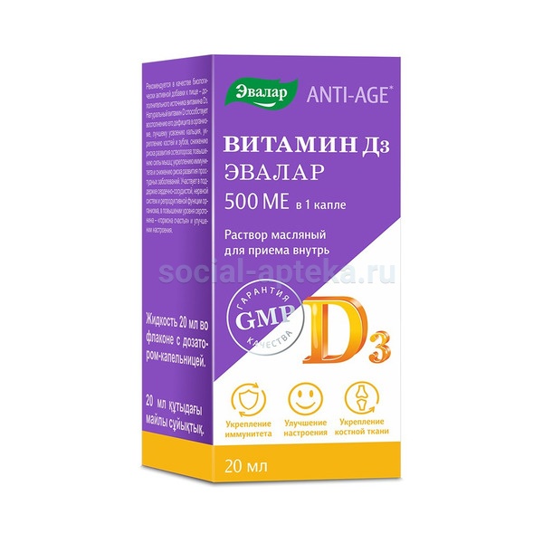 1 капля содержит не менее 12,5 мкг (500 МЕ)1 витамина D3, что составляет 250 %2 от рекомендуемого уровня суточного потребления для взрослых (по нормам ТР ТС3 установленным для суточного потребления пищевых веществ) и находится в пределах нормы суточного потребления (125 %2) для детей с 3 лет (по нормам МР 2.3.1.2432-08).