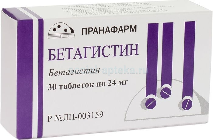 1 таб. бетагистина дигидрохлорид 24 мг Вспомогательные вещества: лактозы моногидрат - 368.1 мг, целлюлоза микрокристаллическая - 16.11 мг, магния стеарат - 4.14 мг, кремния диоксид коллоидный - 2.1 мг, крахмал кукурузный - 5.55 мг.