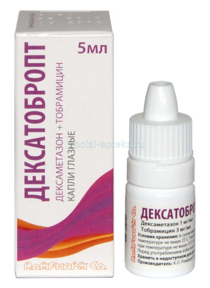ДексаТобропт - комбинированный препарат с антибактериальным и противовоспалительным действием для местного применения в офтальмологии. Тобрамицин антибиотик широкого спектра действия из группы аминогликозидов. Нарушает синтез белка и проницаемость цитоплазматической мембраны микробной клетки. Активен в отношении грамположительных и грамотрицательных микроорганизмов: стафилококков (в том числе Staphylococcus aureus, Staphylococcus epidermidis), включая штаммы, резистентные к метициллину; стрептококков, включая некоторые бета- гемолитические виды группы А, негемолитические виды и некоторые штаммы Streptococcus pneumoniae; Pseudomonas aeruginosa; Escherichia coli; Klebsiella pneumoniae; Enterobacter spp; Proteus mirabilis; Morganella morganii; Citrobacter spp; Haemophilus influenzae; Moraxella spp; Acinetobacter spp; Serratia marcescens. Дексаметазон - синтетический фторированнный глюкокортикостероид (ГКС). Оказывает выраженное противовоспалительное, противоаллергическое и десенсибилизирующее действие. Дексаметазон активно подавляет воспалительные процессы, угнетая выброс эозинофилами медиаторов воспаления, миграцию тучных клеток и уменьшая проницаемость капилляров и вазодилятацию. Не обладает минералокортикоидной активностью.