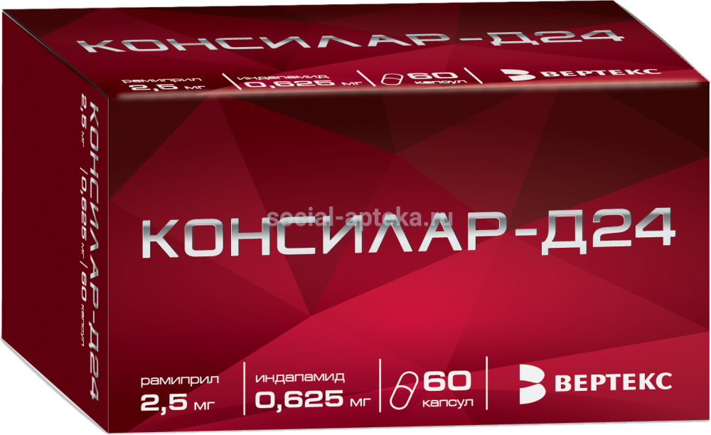 При сердечной недостаточности, в особенности, в острой стадии инфаркта миокарда, лечение препаратом КОНСИЛАР-Д24 следует начинать только в условиях стационара. Одновременное применение препарата КОНСИЛАР-Д24 с препаратами, содержащими алискирен или с АРА II, приводящее к двойной блокаде РААС, не рекомендуется в связи с риском чрезмерного снижения АД, развития гиперкалиемии и ухудшения функции почек по сравнению с монотерапией. Одновременное применение препарата КОНСИЛАР-Д24 и препаратов, содержащих алискирен, противопоказано у пациентов с сахарным диабетом и/или почечной недостаточностью средней и тяжелой степени (СКФ менее 60 мл/мин/1,73 м2 площади поверхности тела) и не рекомендуется у других пациентов. Одновременное применение АРА II противопоказано у пациентов с диабетической нефропатией и не рекомендуется у других пациентов.