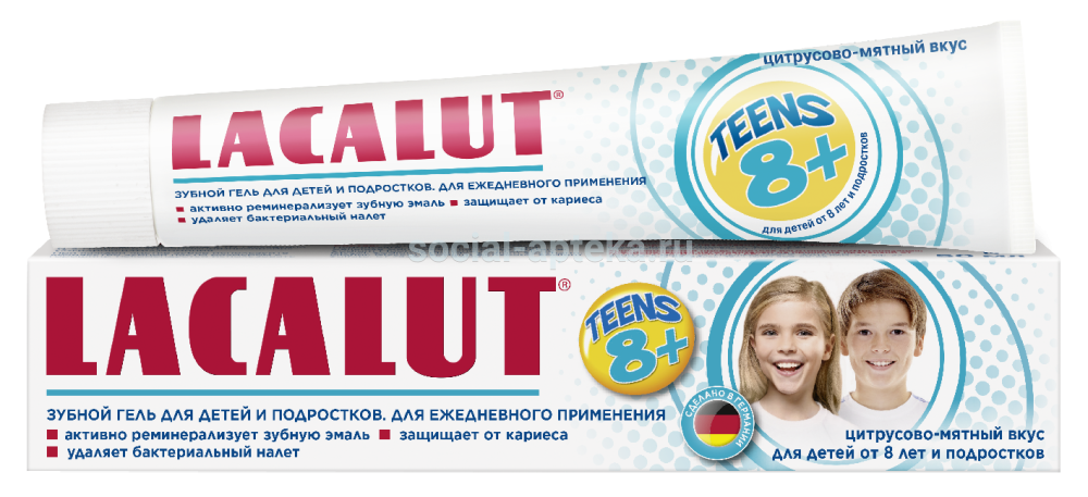 LACALUT teens с оригинальным цитрусово-мятным вкусом, заключенным в микрокапсулы защищает детские зубы от кариеса. Зубная паста LACALUT teens производится на фармацевтическом заводе в Германии. Зубная паста LACALUT teens одобрена Стоматологической Ассоциацией России.