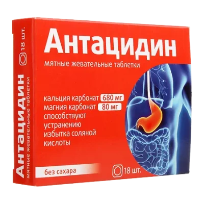 Кальция карбонат и магния карбонат при попадании в желудок вступают в реакцию с находящейся там соляной кислотой, при забросе которой в пищевод человек чувствует неприятные ощущения. В результате нейтрализации соляной кислоты образуется вода и растворимые минеральные соли, причем этот процесс происходит с достаточно высокой скоростью, что способствует быстрому избавлению от таких проявлений дискомфорта, как чувство переполнения в подложечной области, тошнота, отрыжка кислым. Ионы магния помогают усилить образование слизи в желудке, повышая тем самым устойчивость его слизистой оболочки к агрессивному воздействию соляной кислоты. Многие средства для устранения дискомфорта в желудке, в состав которых входят соли кальция, способны вызывать запоры. «Антацидин», кроме карбоната кальция, содержит карбонат магния — два компонента, которые подобраны таким образом, что при приеме в рекомендованных дозах они не вызывают ни усиления запоров, ни их возникновения.