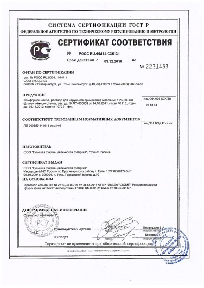 100 мл раствора для наружного применения содержит:Активное вещество: камфора 10 г,Вспомогательные вещества: масло подсолнечное до 100 мл.