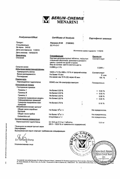 Действующее вещество: лерканидипина гидрохлорид - 20,0 мг.