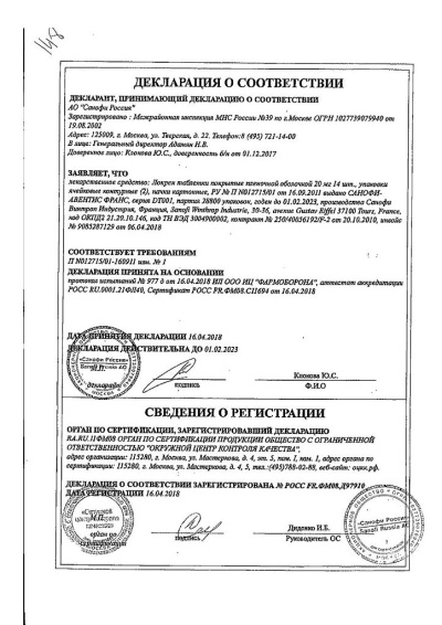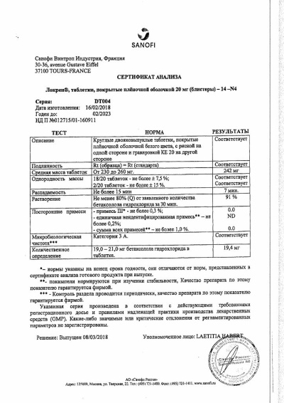Средняя терапевтическая доза составляет 20 мг (1 таб.) 1 раз/сут.При прекращении лечения рекомендуют постепенное уменьшение дозы в течение 1-2 недель, особенно у больных с ИБС, чтобы предупредить развитие синдрома отмены (вследствие вторичной активации симпатической нервной системы).Таблетки принимают внутрь, не разжевывая и запивая достаточным количеством жидкости.У пациентов с нарушениями функции почек и клиренсом креатинина (КК) 20 мл/мин и более, а также у пациентов с печеночной недостаточностью не требуется коррекции суточной дозы Локрена. Однако в начале лечения рекомендуется проводить клиническое наблюдение до достижения равновесных концентраций препарата в плазме крови (в среднем - 4 дня). Для больных с почечной недостаточностью тяжелой степени (КК менее 20 мл/мин) и находящихся на гемодиализе, рекомендуемая начальная доза Локрена составляет 5 мг/сут, независимо от частоты и времени проведения сеансов гемодиализа.