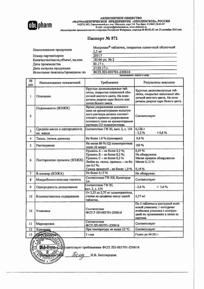 1 таблетка содержит: Действующее вещество: золмитриптан 2,5 мг; Вспомогательные вещества: лактоза безводная 98,0 мг, целлюлоза микрокристаллическая 15,0 мг, карбоксиметилкрахмал натрия (натрия крахмала гликолят) 3,0 мг, магния стеарат 1,5 мг; Вспомогательные вещества для оболочки: гипромеллоза (гидроксипропилметилцеллюлоза 2,4 мг, макрогол 6000 (полиэтиленгликоль 6000) 0,55 мг, титана диоксид 0,6 мг, тальк 0,39 мг, железа оксид желтый 0,06 мг.