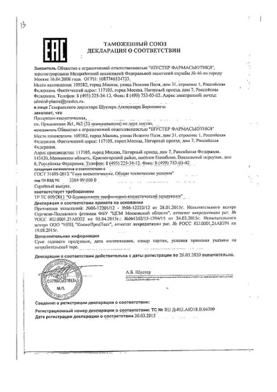 Вода очищенная, экстракты мелиссы, сабельника, конского каштана (подагровое дерево), гидрогенизированное касторовое масло, ПЭГ 400, глицерин, муравьиный спирт, циклометикон, карбомер, триэтаноламин, цетеариловый спирт, хондролон, коллаген, эластин, экстракт прополиса, масло облепихи, ланолин, лецитин, камфора, трилон Б, катон, ароматизатор, родамин С, Е 102
