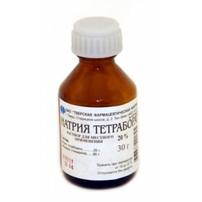 Раствор для местного применения 20%: в 100 г содержится боракс (натрия тетраборат) - 20 г.