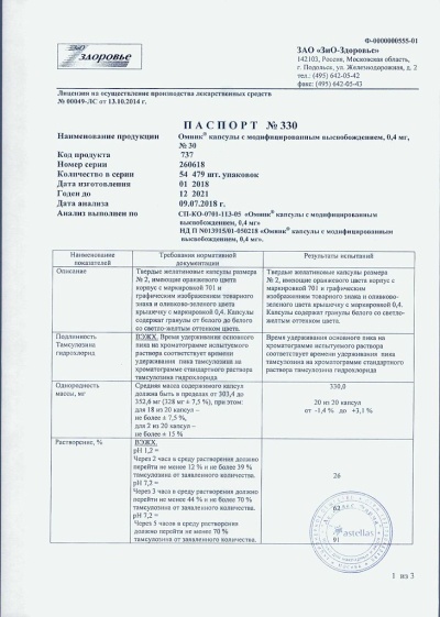 Омник- альфа-адренолитическое.ФармакодинамикаБлокада α1-адренорецепторов тамсулозином приводит к снижению тонуса гладкой мускулатуры предстательной железы, шейки мочевого пузыря и простатической части уретры и улучшению оттока мочи. Одновременно уменьшаются как симптомы опорожнения, так и симптомы наполнения, обусловленные повышенным тонусом гладкой мускулатуры и детрузорной гиперактивностью при доброкачественной гиперплазии предстательной железы.Способность тамсулозина воздействовать на α1А-подтип адренорецепторов в 20 раз превосходит его способность взаимодействовать с α1B-подтипом адренорецепторов, которые расположены в гладких мышцах сосудов. Благодаря своей высокой селективности, тамсулозин не вызывает клинически значимого снижения системного АД как у пациентов с артериальной гипертензией, так и у пациентов с нормальным исходным АД.ФармакокинетикаВсасываниеТамсулозин хорошо всасывается в кишечнике и обладает почти 100% биодоступностью. Всасывание тамсулозина несколько замедляется после приема пищи. Одинаковый уровень всасывания может быть достигнут в том случае, если пациент каждый раз принимает препарат после обычного завтрака. Тамсулозин характеризуется линейной кинетикой. После однократного приема внутрь 0,4 мг препарата его Cmax в плазме достигается через 6 ч. После многократного приема внутрь 0,4 мг в день равновесная концентрация достигается к 5-му дню, при этом ее значение примерно на 2/3 выше значения этого параметра после приема однократной дозы.РаспределениеСвязывание с белками плазмы — 99%, объем распределения небольшой (около 0,2 л/кг).МетаболизмТамсулозин медленно метаболизируется в печени с образованием менее активных метаболитов. Бóльшая часть тамсулозина представлена в плазме крови в неизмененной форме.В эксперименте выявлена способность тамсулозина незначительно индуцировать активность микросомальных ферментов печени.При незначительной и умеренной степени печеночной недостаточности не требуется коррекции режима дозирования.ВыведениеТамсулозин и его метаболиты главным образом выводятся с мочой, при этом около 9% препарата выделяется в неизмененном виде.T1/2 препарата при однократном приеме 0,4 мг после еды составляет 10 ч, при многократном — 13 ч.При почечной недостаточности не требуется снижения дозы, при наличии у пациента тяжелой почечной недостаточности (Cl креатинина