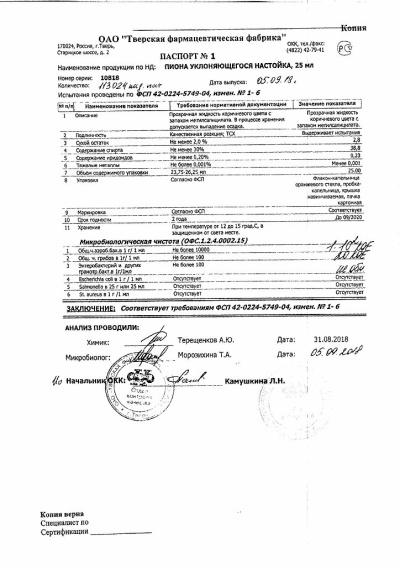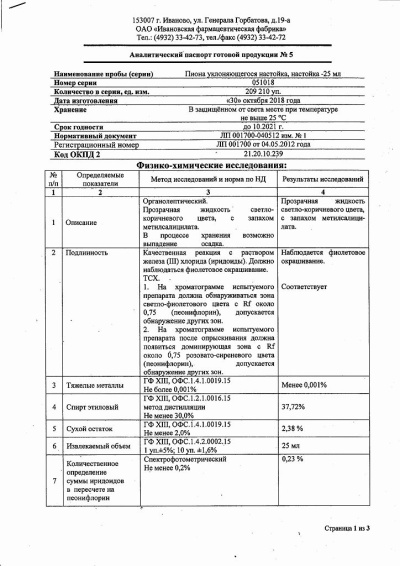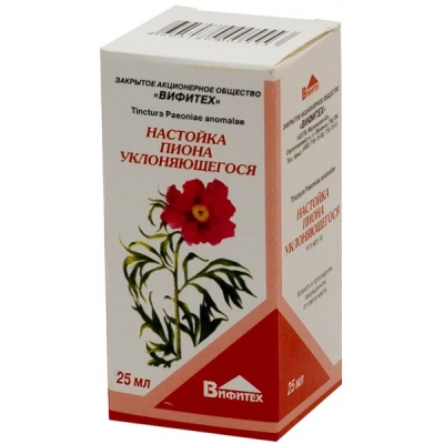 Действующие вещества: пиона уклоняющегося трава - 50 г, пиона уклоняющегося корневища и корни - 50 г;Вспомогательное вещество: этанол 40%;