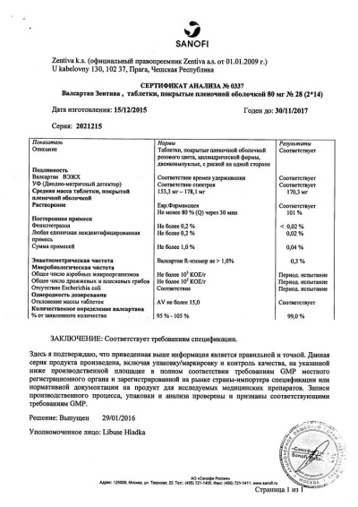1 таблетка содержит: Действующее вещество: валсартан 80 мг Вспомогательные вещества: просолв (смесь целлюлозы микрокристаллической 98% и кремния диоксида коллоидного 2%), сорбитол, дестаб магния карбонат 90 (смесь магния карбоната 90%, крахмала прежелатинизированного 9% и воды 1%) , крахмал кукурузный прежелатинизированный, повидон К25, натрия стеарилфумарат, натрия лаурилсульфат, кросповидон (тип А), кремния диоксид коллоидный безводный. Состав пленочной оболочки: опадрай OY-L-28900 (смесь лактозы моногидрата 36%, гипромеллозы 2910 - 28%, титана диоксида 26% и макрогола 10%), краситель железа оксид желтый, краситель железа оксид коричневый.