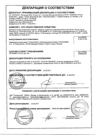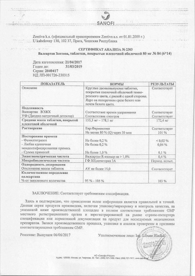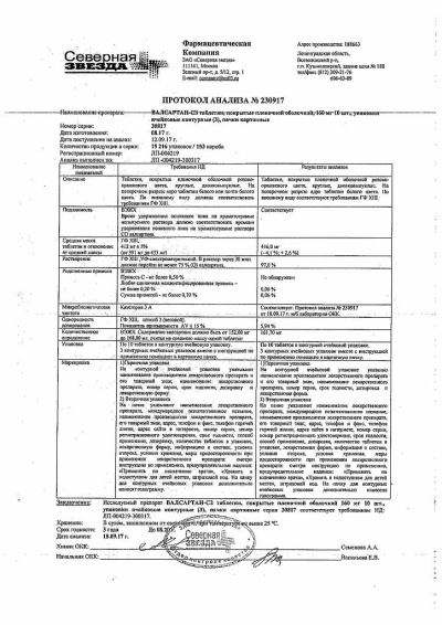 Валсартан - периферический вазодилататор, оказывает гипотензивное действие. Специфический блокатор AT1 рецепторов ангиотензина II, не ингибирует АПФ; не влияет на содержание общего холестерина, ТГ, глюкозы и мочевой кислоты в крови. Начало эффекта отмечается через 2 ч после приема, максимум - через 4-6 ч; продолжительность действия - более 24 ч. После регулярного приема максимальное снижение АД наступает через 2-4 нед. Отсутствует синдром "отмены" при внезапном прекращении приема.